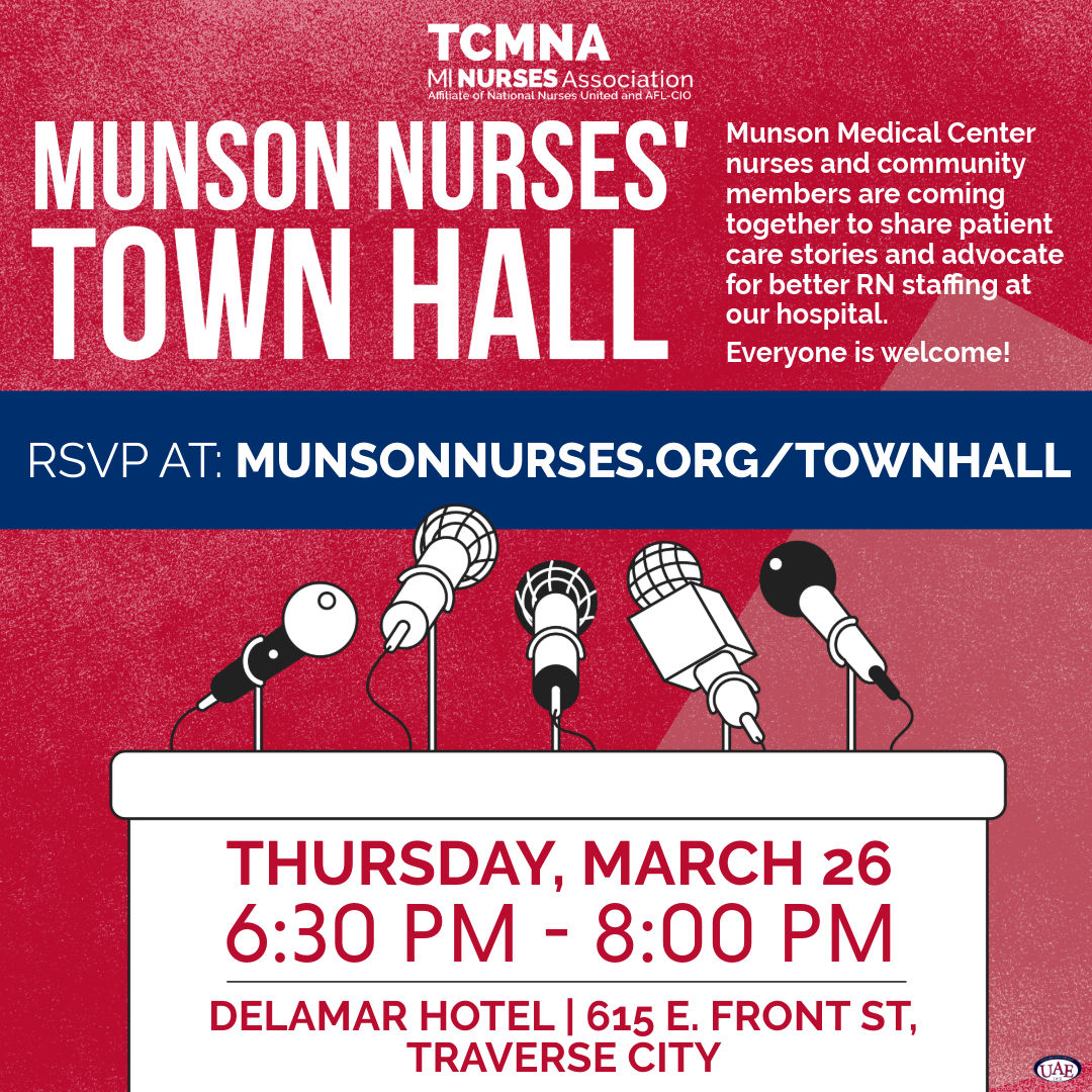 Calendar Town Hall March 26, 2026 6:30PM - 8:00PM Delamar Hotel RSVP Northern Michigan deserves the very best in health care. MMC nurses and the community are coming together to discuss the need for safe staffing at our local hospital and support the nurses' calls for change as they negotiate a new contract.